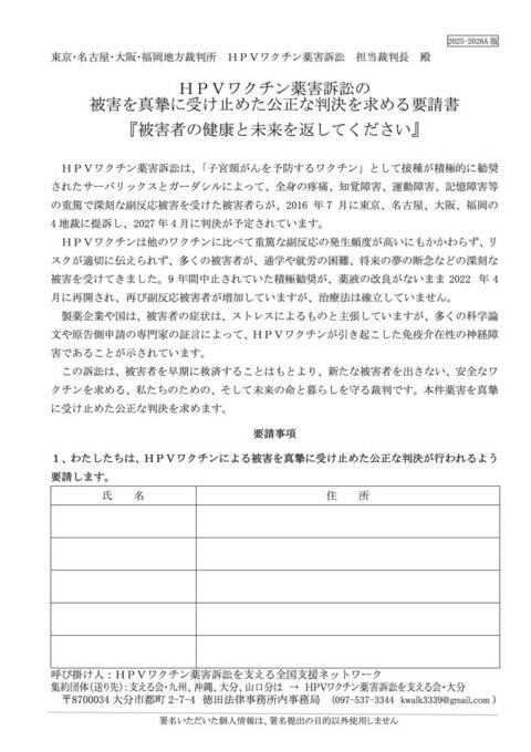 HPVワクチン薬害訴訟の被害を真摯に受け止めた公正な判決を求める要請書