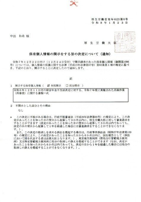 先日、ついに厚生労働省から「保有個人情報の開示決定通知」が届きました。