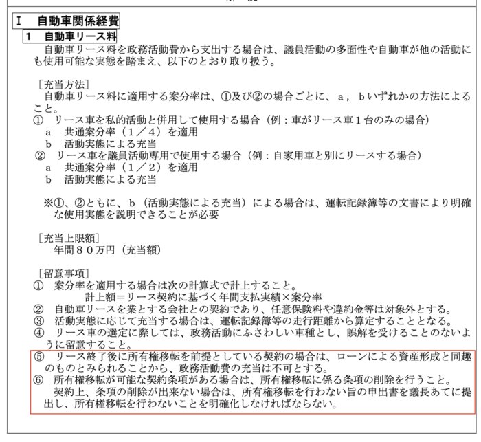 リース車の所有権移転は、ローンによる資産形成と同趣のものと見られることから、政務活動費の充当は不可とする