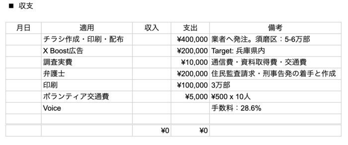 私たちはこれまで自費でチラシ印刷・配布などをしてきました。しかし、事実をより多くの人に届けるには、一定の資金が必要です。