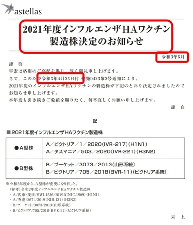 流行の前に株を決めて、製造に入っています。2021年のインフルエンザワクチンの製造株は2021年4月下旬に決定しました。