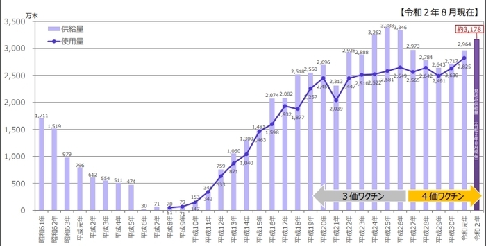 インフルエンザワクチンの製造量・供給量が増え続けています。2020年-2021年シーズンは約3,178万本と過去最高の供給量に。今シーズンは2,867万本(成人5600万人分)が供給されました。
