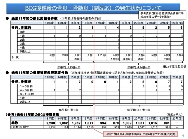 BCGワクチンは平成17年までは4歳未満の児童が対象でしたが、平成17年に生後6ヵ月までに対象が変更されました。すると、生後3~4ヵ月の乳児に、BCGによる骨炎の副反応報告が増えたため、平成25年度以降は生後1歳に至るまでの接種に変更されました。ワクチン行政は紆余曲折しています。