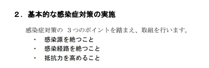 マニュアルには「児童生徒への指導」のなかに「基本的な感染症対策の実施」という項目があります。そこには大きく3つの対策が書かれています。