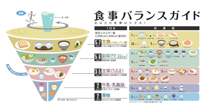国が定めた「食事のバランスガイド」に「ご飯をしっかり食べて、おかずや果物などをバランスよく組み合わせましょう」とあります。一昔前に言われた「1日30品目をバランスよく」ということは、どこにも書いてありません。