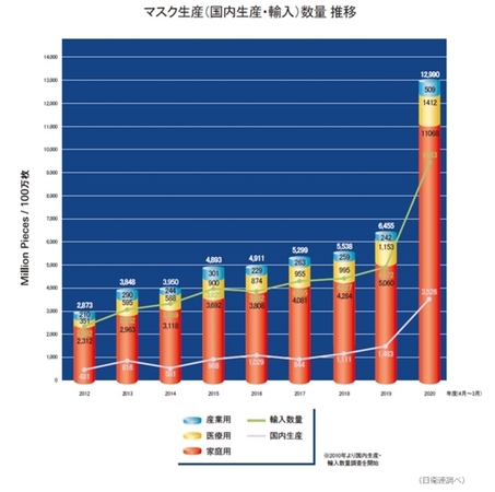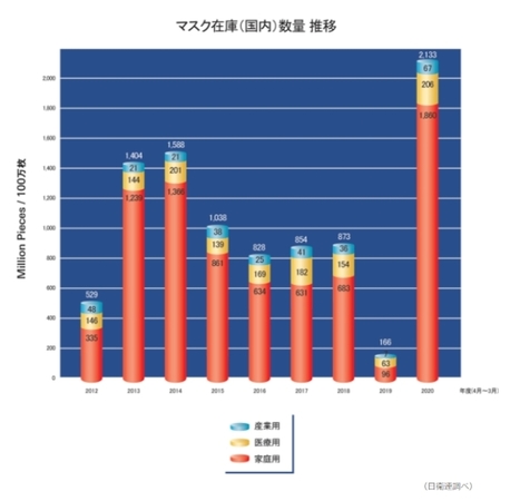 マスクの生産・在庫数量の推移です。2020年に急激に増加しました。
