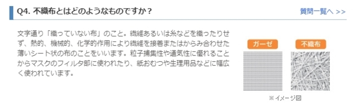 生産されているマスクの9割は不織布マスクです。不織布とは、文字通り「織っていない布」のこと。熱的・機械的・化学的作用により、繊維を接着またはからみ合わせた薄いシート状の布のことです。