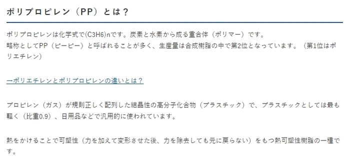 不織布マスクの素材で多いのが「PP(ポリプロピレン)」です。ポリプロピレンはプラスチックの素材の1つ。不織布マスクは紙のように見えますが、石油製品です。