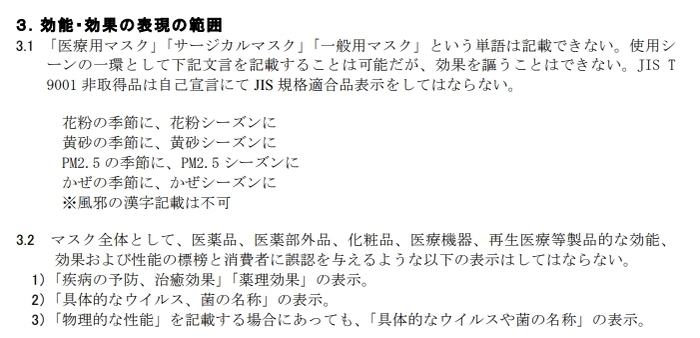 マスクは「雑貨」です。医薬品や医薬部外品ではありません。そのため、マスクは効能・効果を謳えません。日本衛生材料工業連合会はマスクの表示・広告自主基準に「効果を謳うことはできない」とあります。