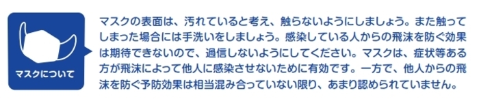 「感染している人からの飛沫を防ぐ効果は期待できないので、過信しないようにしてください。マスクは、症状等ある方が飛沫によって他人に感染させないために有効です。一方で、他人からの飛沫を防ぐ予防効果は相当混み合っていない限り、あまり認められていません。」