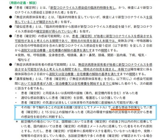「手で触れることの出来る距離(目安として1メートル)で、必要な感染予防策なしで、「患者(確定例)」と 15 分以上の接触があった者(周辺の環境や接触の状況等個々の状況から患者の感染性を総合的に判断する)。」