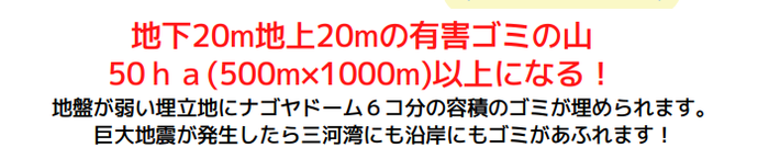 計画地は、もともと明治時代に埋め⽴てられた⼟地であり、地盤が安定しているとは⾔えません。国・県 によって南海トラフ巨⼤地震が30 年以内に約 80%の確率で発⽣することが想定されています。その液状化 の危険度は極めて⾼く、津波浸⽔想定 4.4m の区域であり、現在、⾼さが 5m の海岸堤防の沈下率は 75%と されています。⽇本最⼤級の産業廃棄物最終処分場が建設され、最⼤ 1,000 万㎥もの産業廃棄物が内陸部や 三河湾 (国定公園) 全体に拡散されれば、さらに甚⼤な被害が⽣じることから、計画地として適していないことは明らかです。