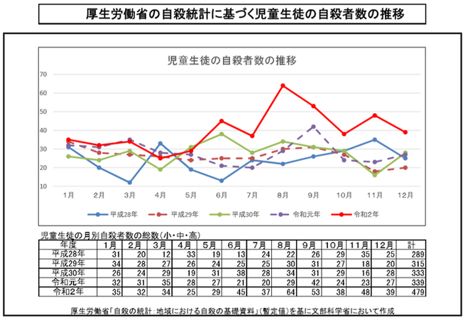 『厚生労働省の自殺統計からも分かる通り、児童生徒の自殺者数は毎年増加しています。夏休みの開ける8月、9月も増える傾向にあり、対策は急務です。』