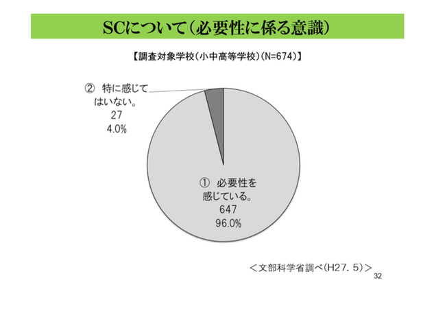 学校における教育相談に関する資料<文部科学省調べ(H27.5)>によると、上の図のように96%の学校がSCの必要性を感じている。
