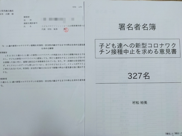 327名のご署名をいただき、2/21日に山梨県内25市町村へ郵送にて、北杜市は手渡しにて提出いたしました。甲府市、山梨県へは3/7に手渡しにて提出する予定になっております。また、甲府市、中央市、甲州市、都留市は請願に、北杜市は議員様より直接市長にお話して頂くことができました。他市町村と山梨県へは、陳情書を提出いたしました。