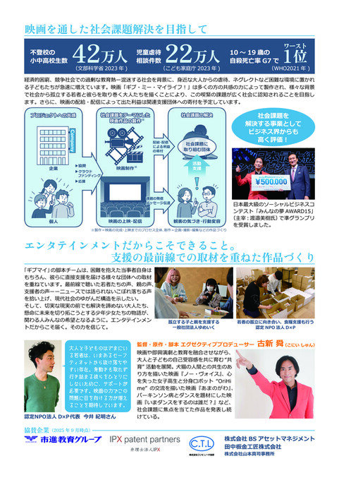 チラシ裏面には、作品の製作意図や監督の紹介、取材に協力いただいている支援団体のご紹介も。