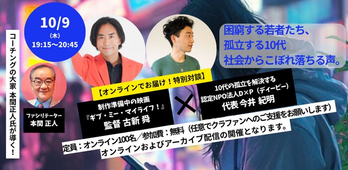 本イベントでは、社会課題をテーマにした映画づくりを通じて“声なき声”をすくい上げてきた監督・古新舜と、「グリ下」の現場で10代の若者と向き合い続ける認定NPO法人D×P代表・今井紀明が、困難を抱えた若者との向き合い方と映画を通して発信するメッセージの可能性について熱く語り合います。(ファシリテーター:本間正人)