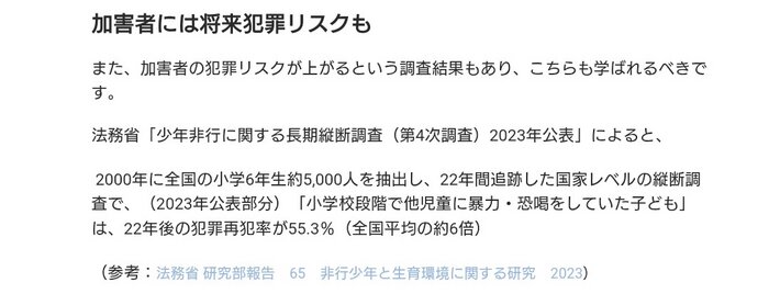 - 研究結果:2014年、東京大学大学院の滝沢 龍 准教授とキングス・カレッジ・ロンドンのコホート研究で、7歳~11歳までにいじめを経験した人に追跡調査を行ったところ、被害者はうつ病1.95倍、不安障害1.65倍、