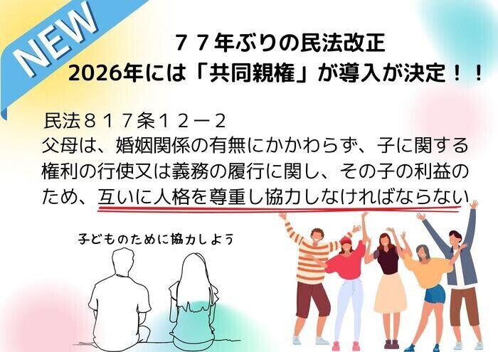 さて、来年春ごろ、共同親権導入の「新民法」が施行されます。
