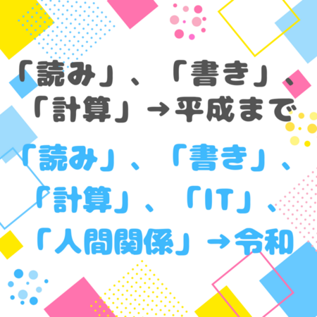 「読み」、「書き」、「計算」、「IT」、「人間関係(非認知能力)」→令和