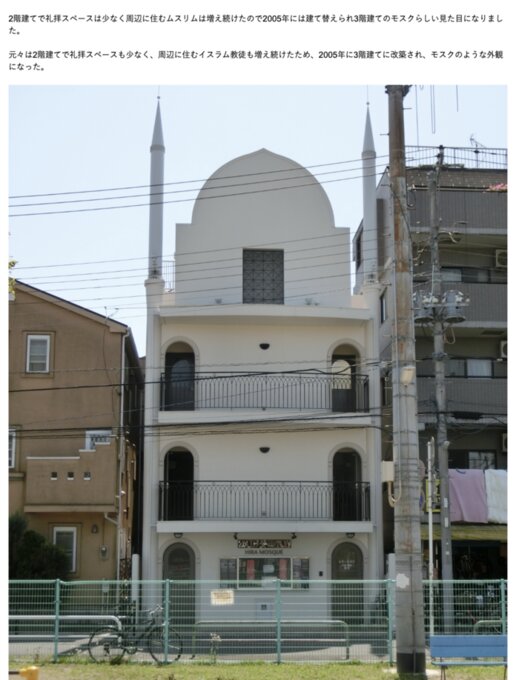 行徳モスクは、1997年にイスラミック・サークル・オブ・ジャパン(ICOJ)の主導のもと周辺に住んでいたムスリムの募金活動により設立されました。2005年に改築され、現在のモスクのような見た目になりました。(Wikipediaより)