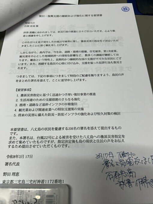 2025年10月10日に伊豆諸島を直撃した台風22号により、東京都八丈島では甚大な被害を被りました。中でも水源となる配水池の被害は深刻で、断水が繰り返される状態です。島嶼であることから、物資の輸送もパンク状態であり、復旧資材等の島内搬入にも大きな支障があります。断水や水を普通に使えないことは、産業の存続だけでなく命にかかわります。局地激甚災害指定を1日でも早く指定、適用を持って、八丈島を助けてください。どうぞよろしくお願いいたします。