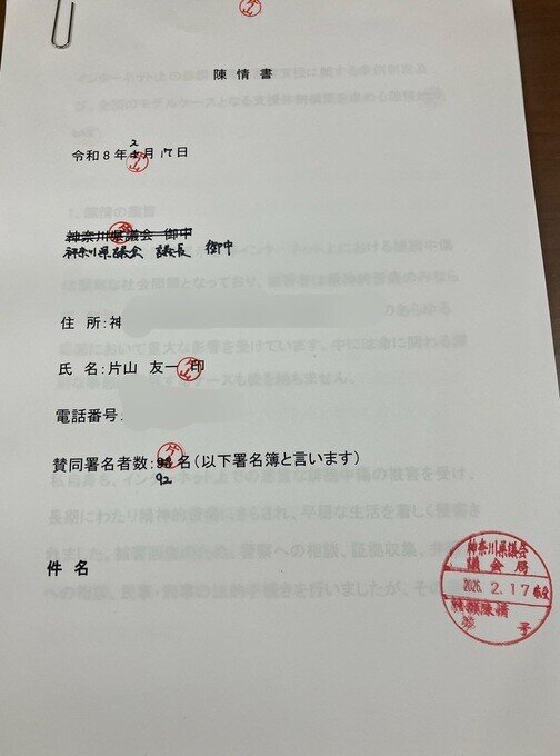 ネット誹謗中傷被害者支援条例の制定の要望書を署名簿と共に提出予定