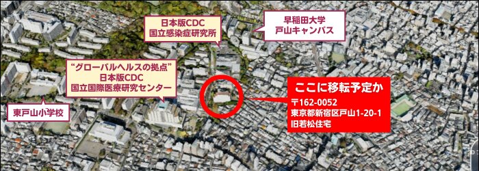 厚生労働省はこのBSL4施設を都心に移転させる方針です。移転先は公表していませんが、新宿区戸山1-20-1 旧若松住宅の跡地が有力候補と噂されています。