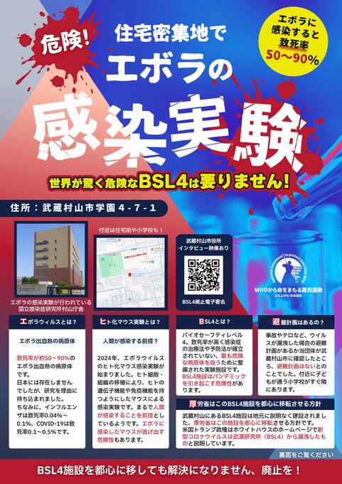 東京都武蔵村山市にある国立感染症研究所(NIID)村山庁舎のBSL4施設では、2024年(令和6年)2月、エボラウイルス等のヒト化マウスへの感染実験が始まってしまいました。このエボラウイルスは非常に致死率が高く、そもそも日本には元来存在しないため、わざわざ海外から国内に持ち込んで研究する必要がありません。我々は、このような危険なウイルスを扱う、BSL4施設の廃止を求めます。