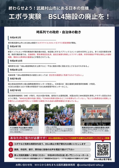 武漢研究所の二の舞にならぬよう、都内・武蔵村山市住宅地でエボラ等感染実験を行うBSL4施設の廃止を求めて参ります。