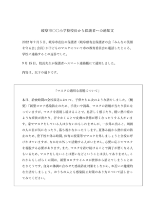 なぜ、岐阜市なのかと言いますと、実は、市内に住む当会会員の保護者が教育委員会へお子さんのマスクについて相談した結果、校長先生へ連絡すると伝え、数日後に校長先生からこのような通知が保護者の元に届きました!!