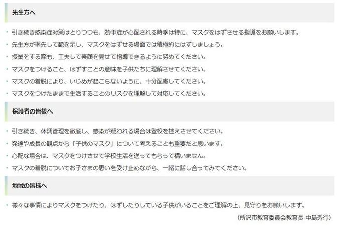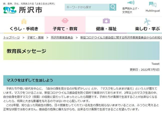 その一つの良例として、今注目されているのが、7月5日付で所沢市ホームページに掲載された下記の「教育長メッセージ」です。
