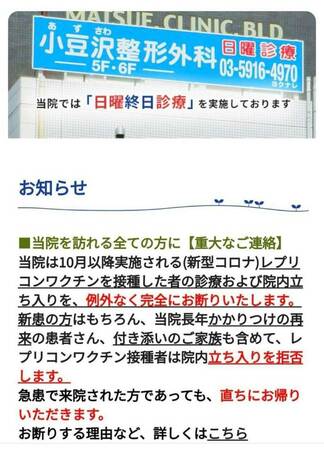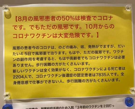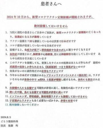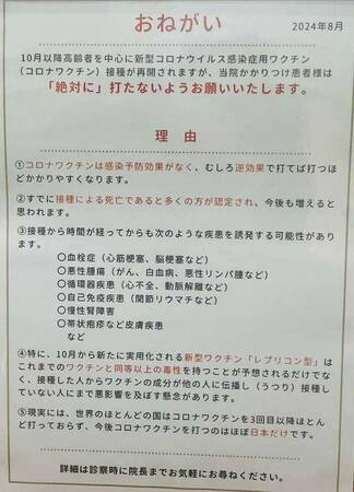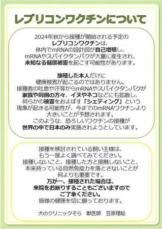 今秋10月接種開始予定の「レプリコンワクチン」については、その危険性を危惧する医療現場から、早々に、下記のような注意喚起のアナウンスや掲示物が来院者に向けて発布されています。ご確認下さい。