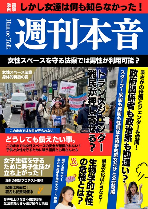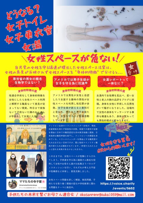 女性スペースの身体的特徴での法案は、大変危険です。昨日まで家庭を持ち子供までいたおじさんと入浴できますか?または、奥様や彼女、お子様を入浴させますか?