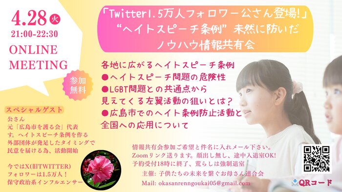 市民活動を始めて早3年。これまで出会ってきた皆さんや議員さんに力を借りながら今もなお過剰な「性教育やジェンダー教育」から子供達を守る為活動しています‼️市民団体同士団結して日本全体で起きている問題を共有し学びませんか?今回は全国各地で施行されたり左翼により提案がなされているヘイトスピーチ条例が施行されるのを未然に防止する事に成功した市民団体率いる方にスペシャルゲストになって頂きます🤗成功事例やノウハウを参考にしたい✊貴重な機会にぜひ、ご参加下さい。