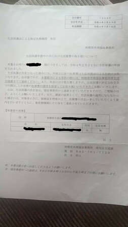 相模原から練馬に生活保護移管手続きされました。練馬で再度生保を申請するように指示があり、生保申請中です。病院に行く必要がありますが、石神井福祉事務所 が行かせてくれなくて困ってます。 石神井福祉事務所に「医療券、もしくは医療機関へ持っていく手紙(添付画像のような手紙)を発行し受診させてください」とお願いしたのですが、生活保護の申請開始までは、病院受診できないとのことのことです。しかし、生活保護の審査には、二週間から一か月かかります。今この瞬間に具合が悪いのに、その間どうしろというのでしょう。 私は保険証を持っていません。お時間のある方々、石神井福祉事務所 保護第三係 佐藤CW(tel: 03-5393-2813, email: SHAKUJFUKUSI06@city.nerima.tokyo.jp )にご連絡して、病院を受診させないことは、憲法で保障されている基本的人権の侵害だと伝えて頂けませんか。助けてください。
