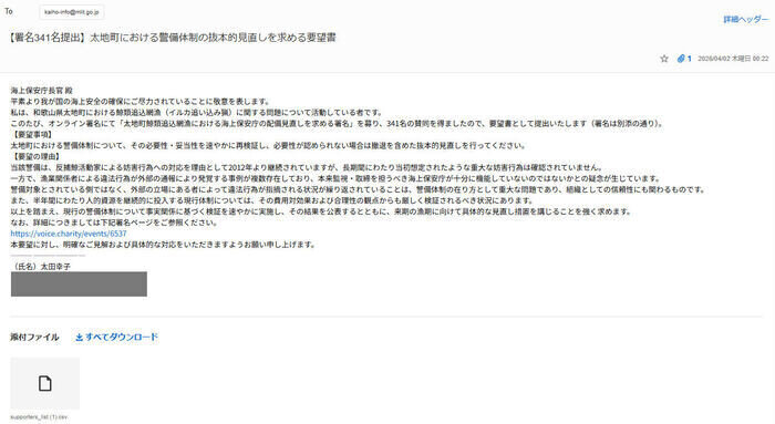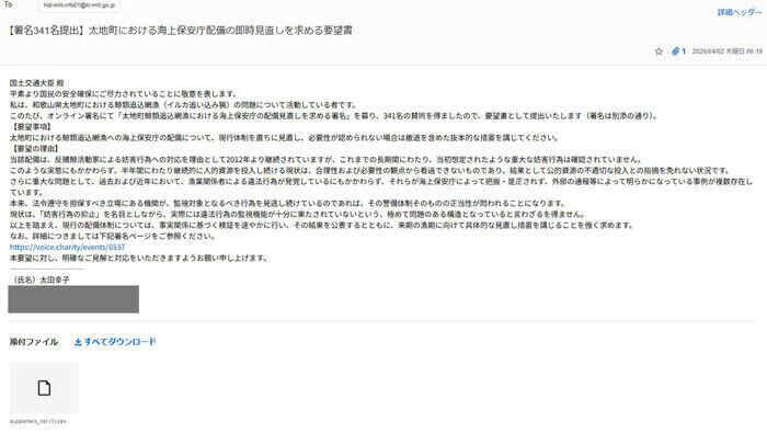 341名の皆様の想いは、環境保護の観点から署名用紙を送付するのではなく、メールにてデータを添付する形で提出させていただきました。