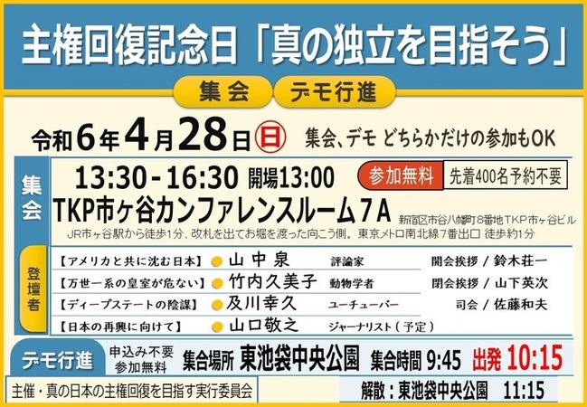 4月28日(日)は、真の独立を目指そう デモ行進が行われます。