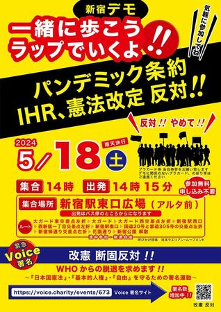 私に送ってくださいました (^_-)-☆ (今回は、WHOの総会が5月末と押し迫っている関係で、改憲関係の主張の方がパンデミック条約やIHR改定反対よりも少なくなっています。)
