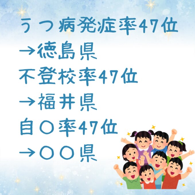 【うつ病発症率47位→徳島県、不登校率47位→福井県、自〇率47位→○○県の共通点と他県へのアドバイス】