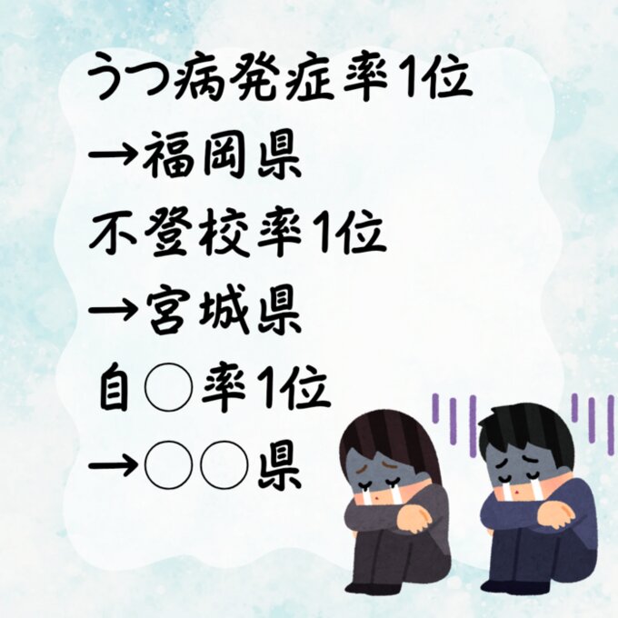 【うつ病発症率1位→福岡県 不登校率1位→宮城県 自○率1位→○○県】