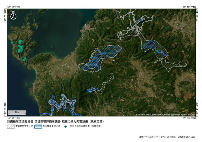 熊本県水俣市は九州山地の南西端に位置し、山地が海まで迫るため平地が少なく、短く急な河川と急斜面が多い地形です。この水俣の鬼岳(おんたけ)と鹿児島県にまたがる郷田山の標高600m以上の溶岩台地に150m級風車30基が計画されています。